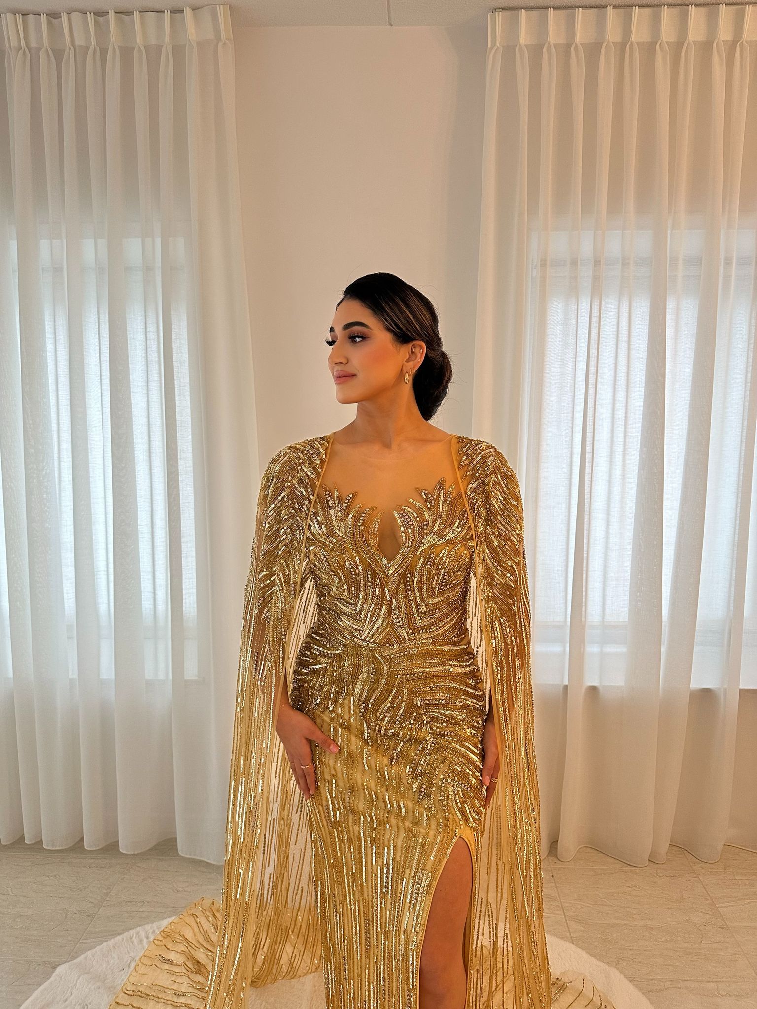 Gouden jurk met afneembare cape. Beschikbaar in 36/38, valt eerder als een ruime 36. Onderkant is mouwloos met een split, lichte stretch.