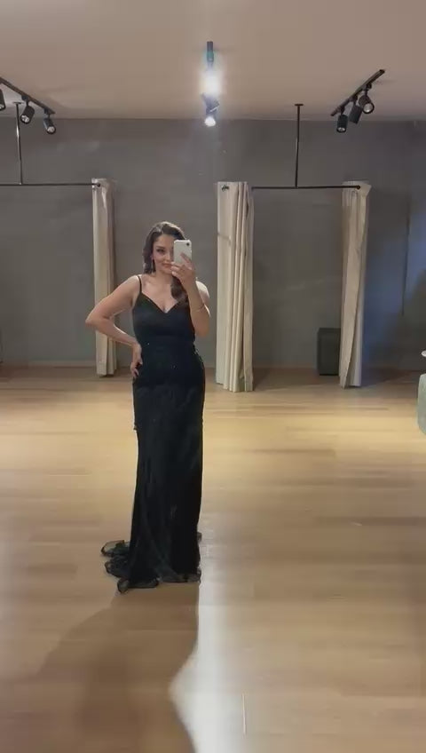 Deze prachtige zwarte jurk met bandjes is volledig bewerkt.