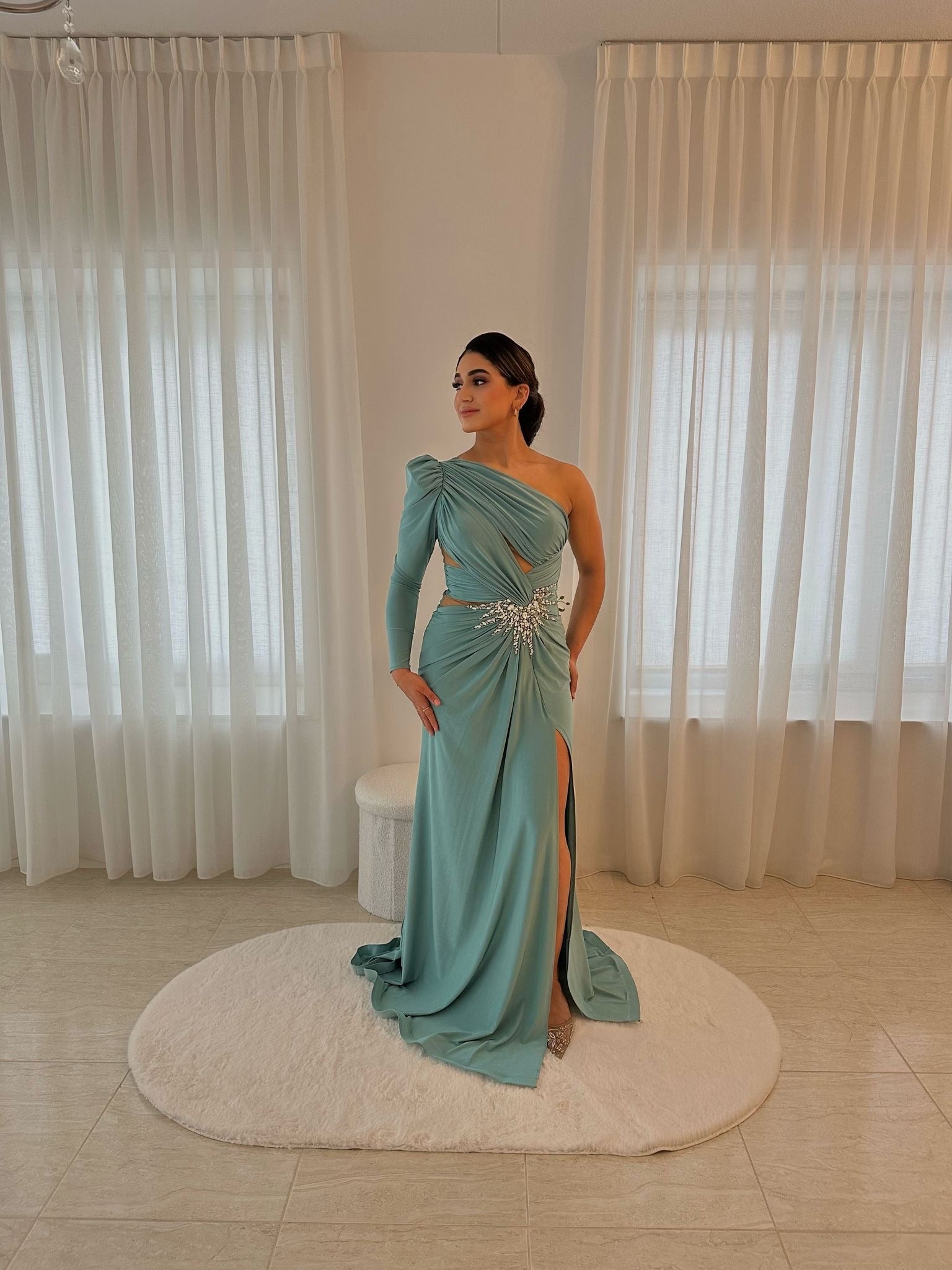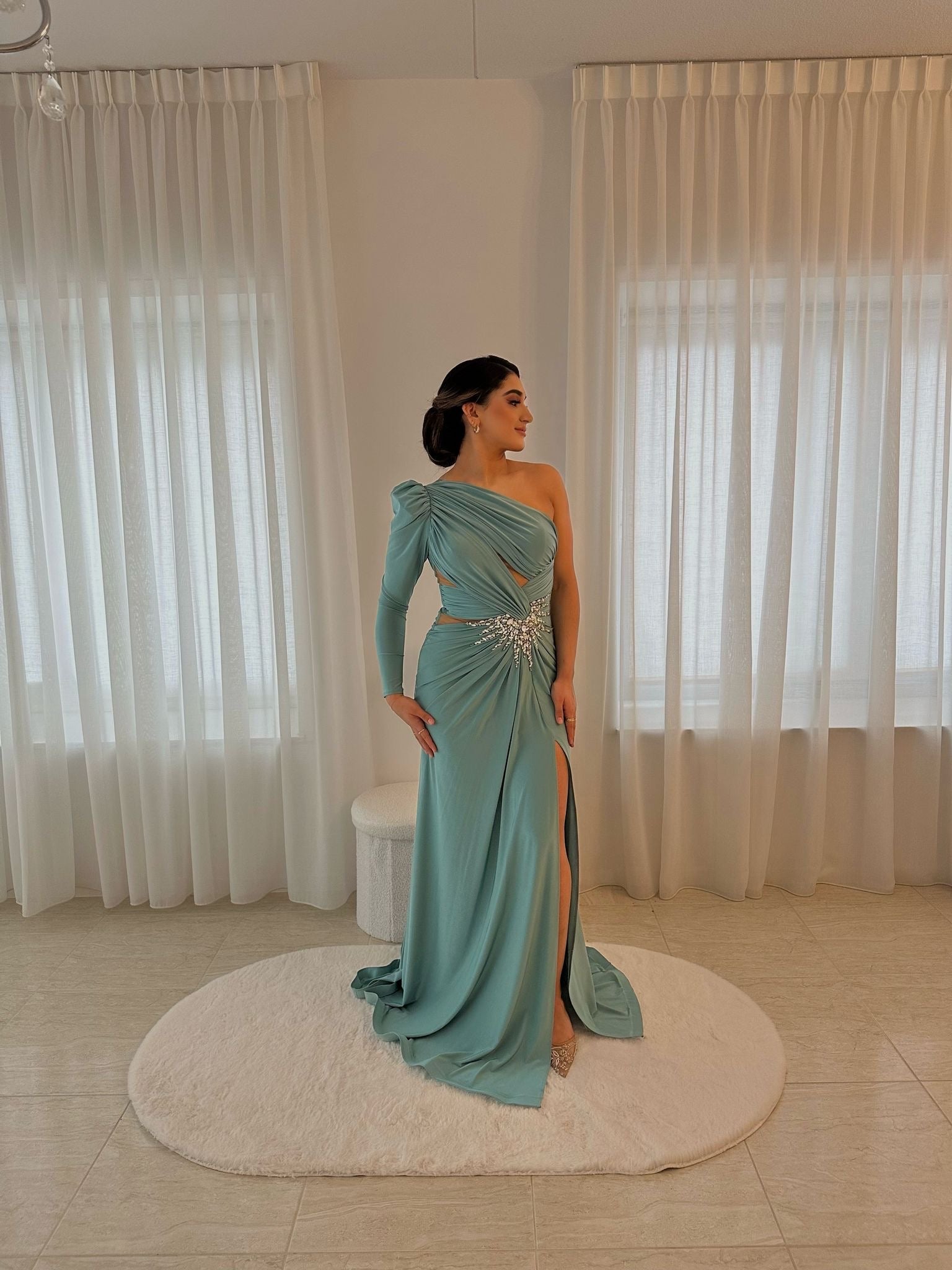 Turqoise kleurige jurk met een vaste mouw. Je kunt hier nog een losse mouw bij krijgen indien gewenst. Heerlijke, flexibele stof. Let op! Jurk heeft plekjes die door schijnen. Aan de voorkant heeft de jurk een split en achter een kleine sleep.