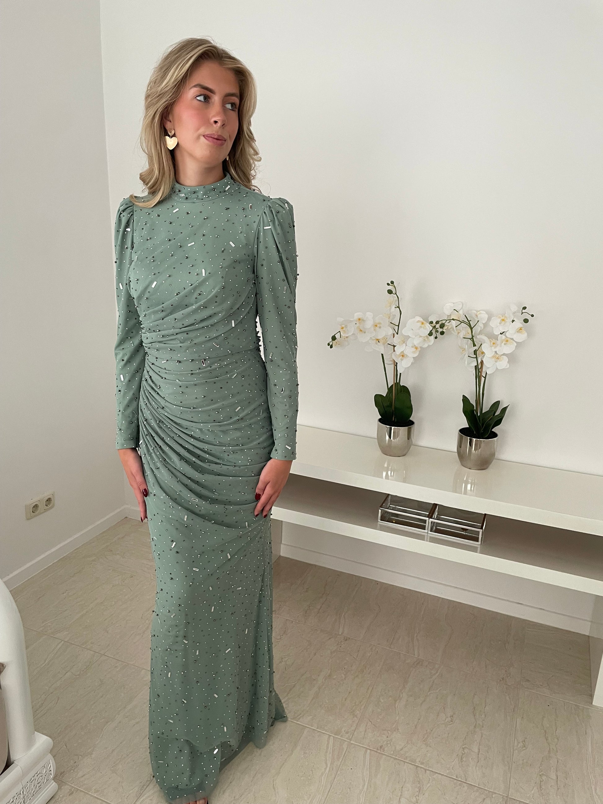 Volledig bedekte mintgroene jurk. Geen stretch, chiffon stof. Bewerking over de gehele jurk.