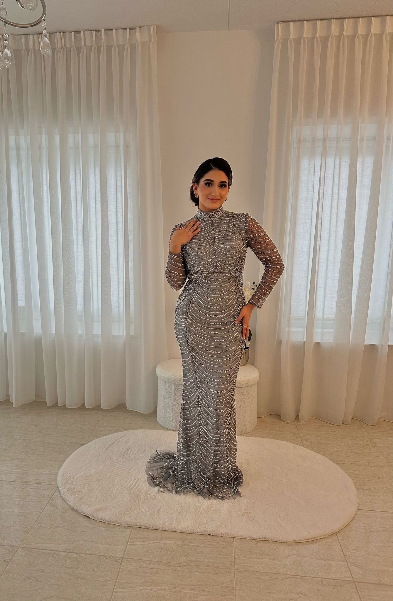 Donker grijze jurk, volledig bewerkt met een stretchy stof. Lange mouwen, licht doorschijnend, kan een body onder aan voor volledige bedekking. Verschillende maten en kleuren beschikbaar. Creme, blauw en grijs, donker en licht.