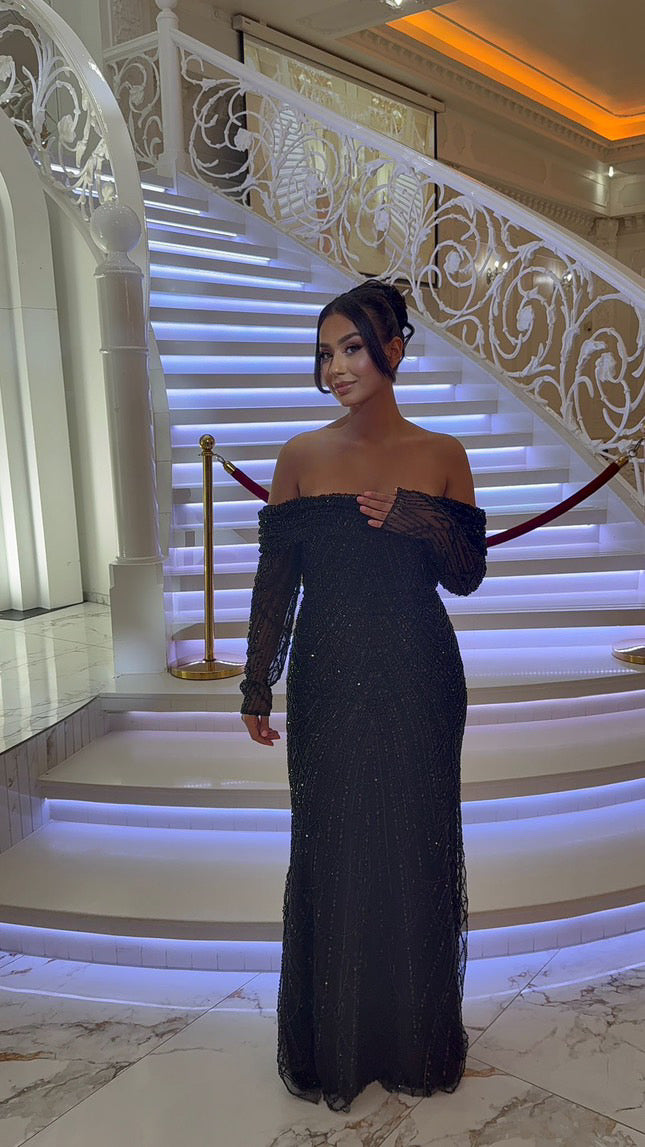Volledig bewerkte zwarte offshoulder jurk. Beschikbaar in 38/40