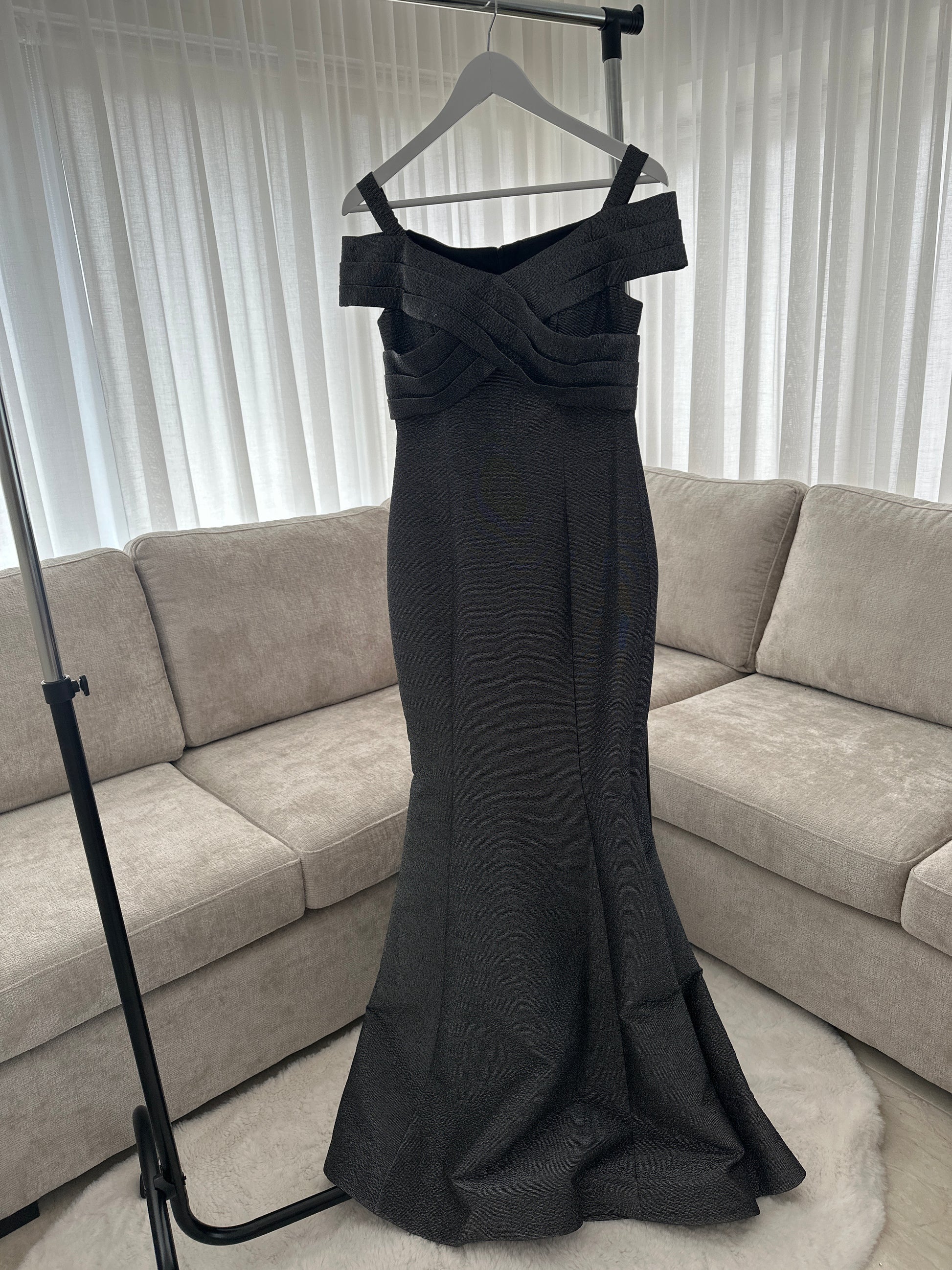Offshoulder donkergrijze maxi jurk in maat 36/38.